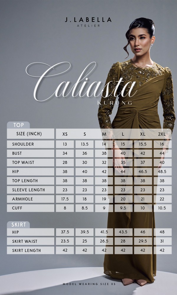 Caliasta Kurung is crafted from premium chiffon with full lining, embodying effortless elegance. The bodice features a cascading ruffle drape that flows gracefully down the front, adding dimension and movement. The yoke and sleeves are adorned with intricate floral lace embroidery, delicately embellished with sequins and beads for a subtle shimmer. This refined piece blends classic femininity with contemporary sophistication.