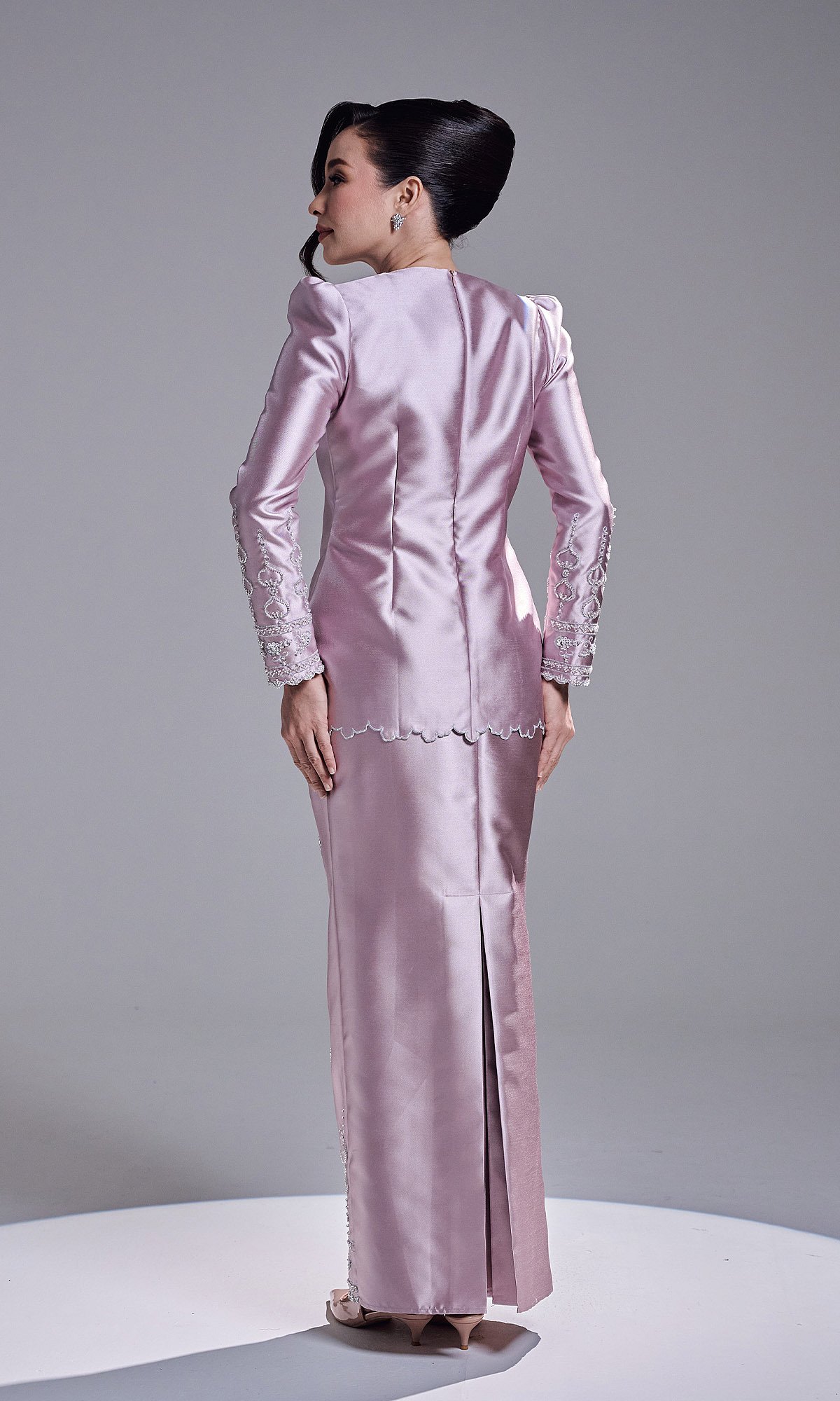 Mistella Kurung is crafted from premium duchess, exuding a refined sheen and structured drape. The bodice features delicate embroidered detailing, adding dimension and elegance to the design. The sleeves and skirt are finished with ornate bead and sequin embroidery, executed in scalloped edging to create a polished couture effect.