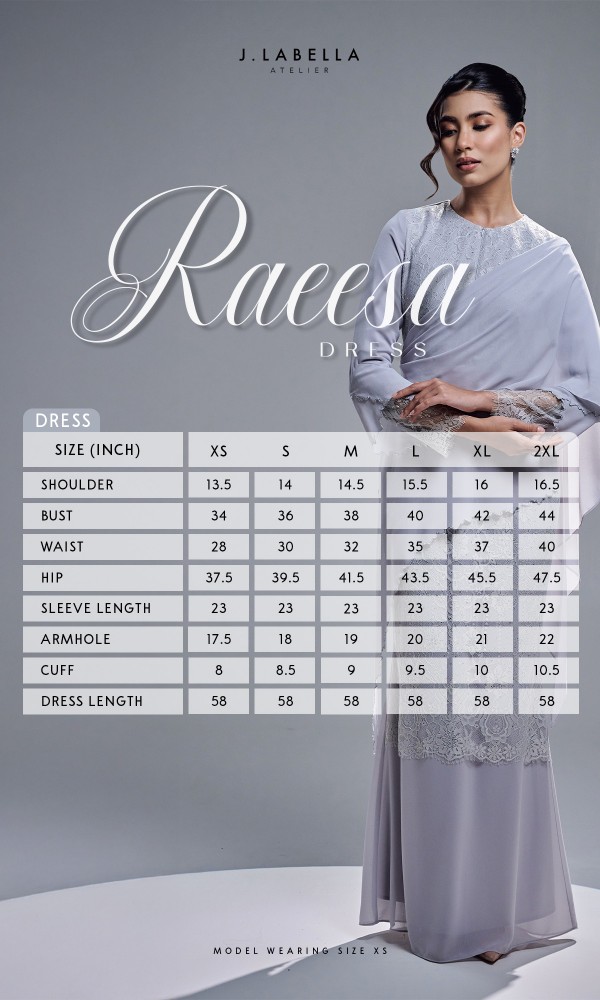 Raeesa Dress embodies refined femininity with its fluid silhouette and intricate detailing. Made from premium chiffon with French lace & Crystal embellishments, it shimmers with subtle elegance. Scalloped lace edges and soft ruffle cuffs add a romantic touch, while a hidden front zip ensures nursing-friendly practicality.
