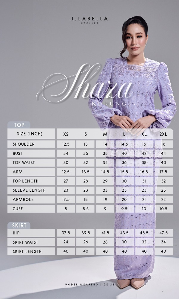 Shaza Kurung is crafted from chiffon adorned with glitter thread embroidery and delicate sequin detailing, creating a refined yet radiant look. The elastic cuffs form gentle ruffles, adding a soft feminine charm, while the structured silhouette enhances its timeless elegance with a touch of modern sophistication.