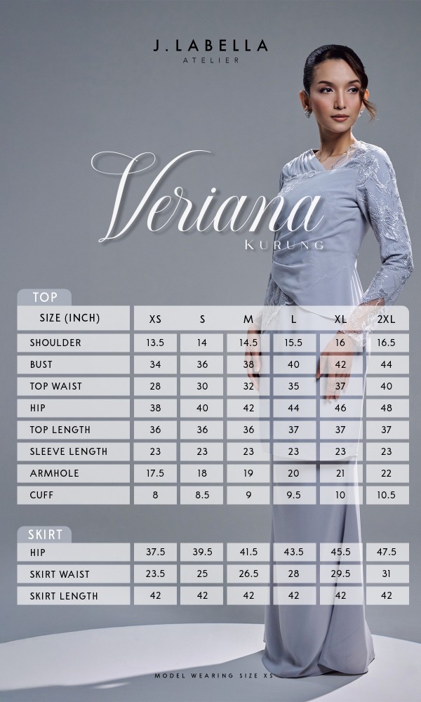 Veriana Kurung is crafted from Premium chiffon, exuding modern sophistication with a soft, graceful flow. The bodice and sleeves feature intricate sequin embroidered lace, lending subtle shimmer and texture. A layered asymmetrical drape across the bodice enhances the silhouette with sculpted elegance, while a chiffon cape cascading from the shoulder completes the look with ethereal movement and timeless femininity.